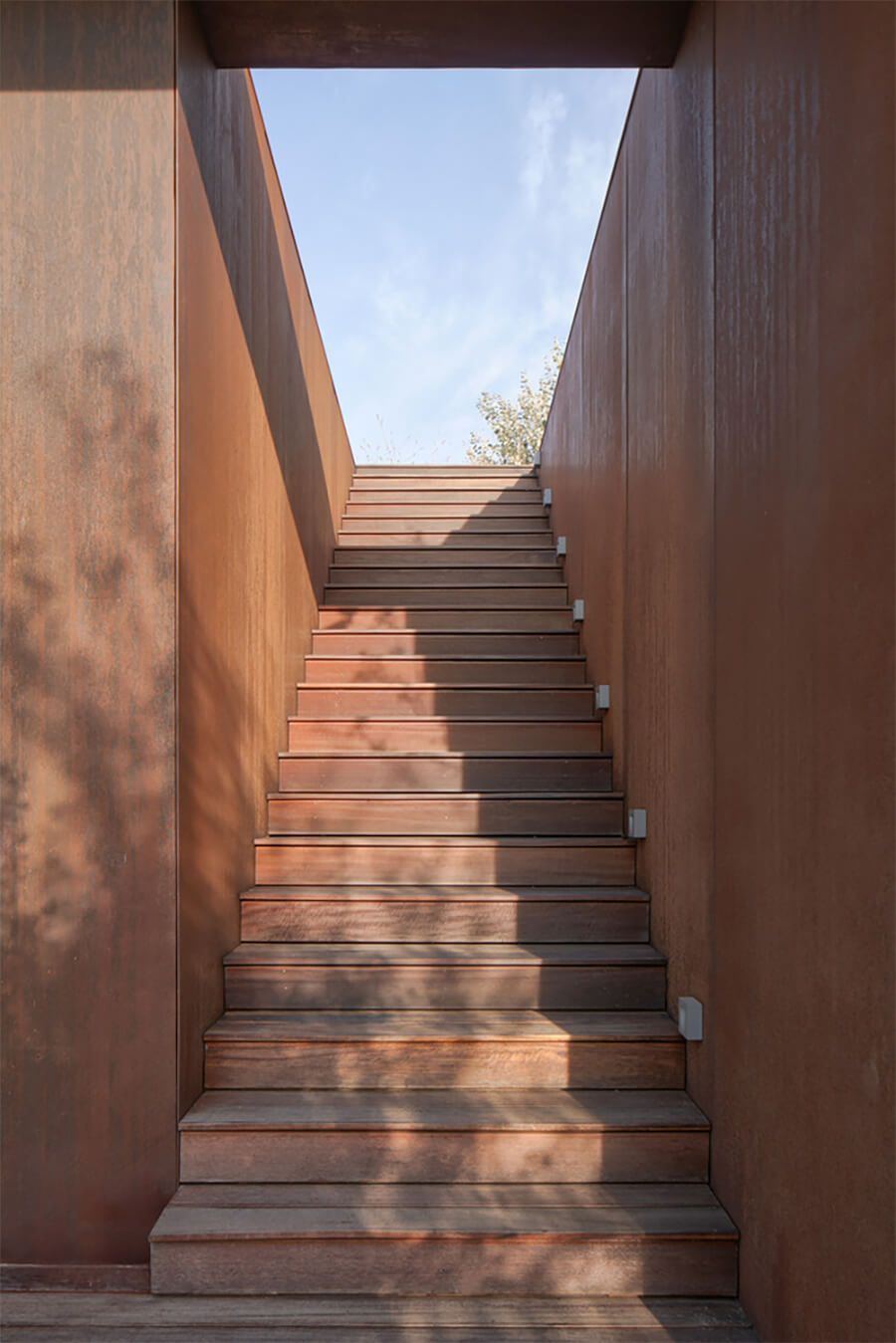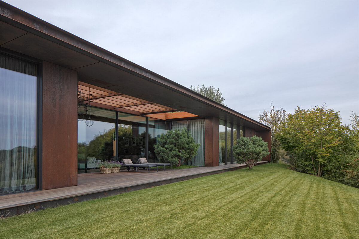 Архітектори вирішили буквально вбудувати дім у схил. Рівень підлоги опущений нижче рівня ґрунту, а покрівля — зелена, заросла травами. З боку річки видно лише тонку лінію карниза, що підкреслює горизонт. Жодних парканів: межі утворюють дикі кущі. Жодних пафосних фасадів: лише кор-тен, сталь, що природно іржавіє, наближаючи будівлю до землі.