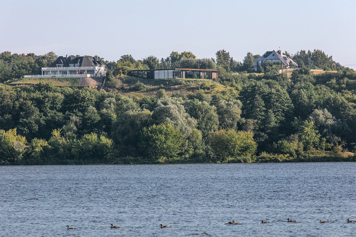 Колись тут була лише дика лука, яка повільно підіймалася до краю схилу, звідки відкривалася панорама річки, старого міста і мостів. Майбутній власник приходив сюди роками — просто дивитися на Віслу. І коли з’явилася ідея будинку, він захотів не панорам, а тихого продовження цієї землі. Так почалася співпраця з архітектором Павелом Надуком із варшавської студії 77 Studio.